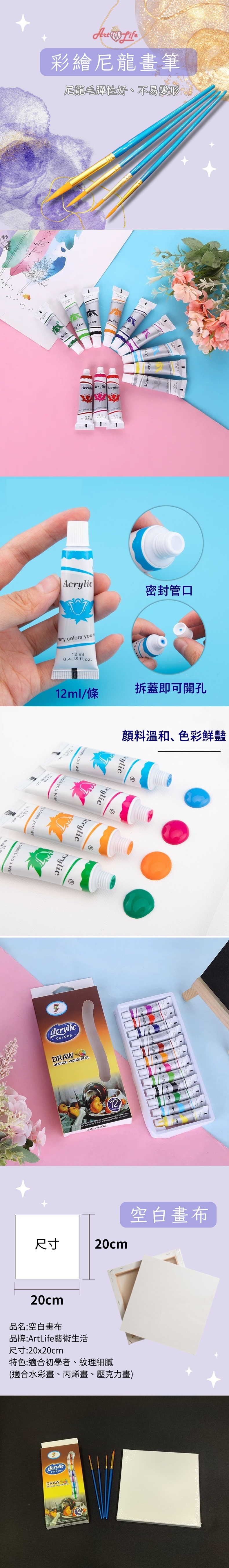 內容物:20*20cm 空白畫布、尼龍畫筆4支裝、丙烯(壓克力)顏料12色12ml/條